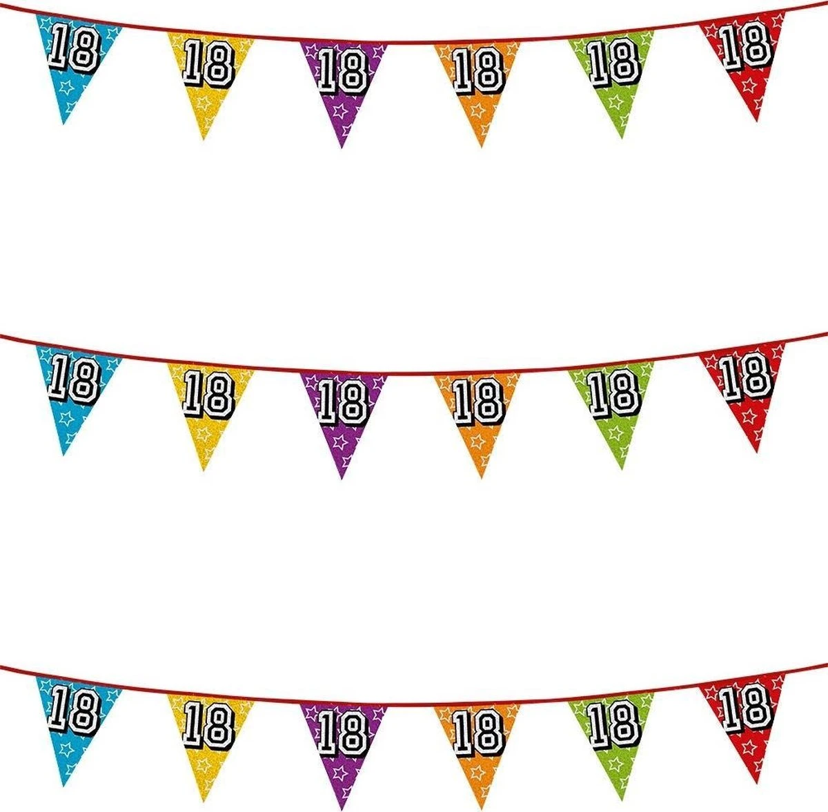 3x étincelles pour un thème d’anniversaire de 18 ans. Bruant scintillant / drapeaux (holographiques) avec guirlandes de drapeaux de différentes couleurs d’environ 8 mètres de long avec le numéro 18 sur chaque drapeau. Faveurs et décorations de fête d’anniversaire. Matière : plastique. Convient pour l’intérieur et l’extérieur. Vous recevrez 3 lignes de drapeau de 8 mètres.