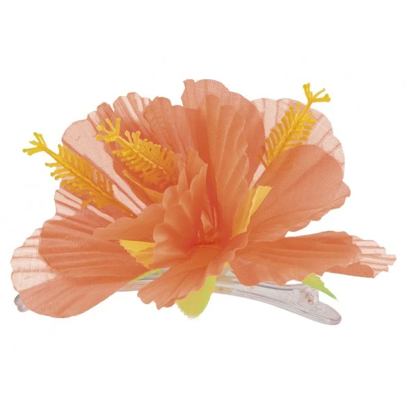 fleur Hawaï orange et jaune montée sur une pince à cheveux.