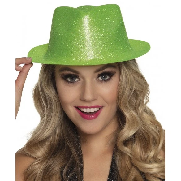 Chapeau borsalino de taille adulte.Pailleté Vert fluo.Idéal pour décos disco ou spectacles,soirée fluo