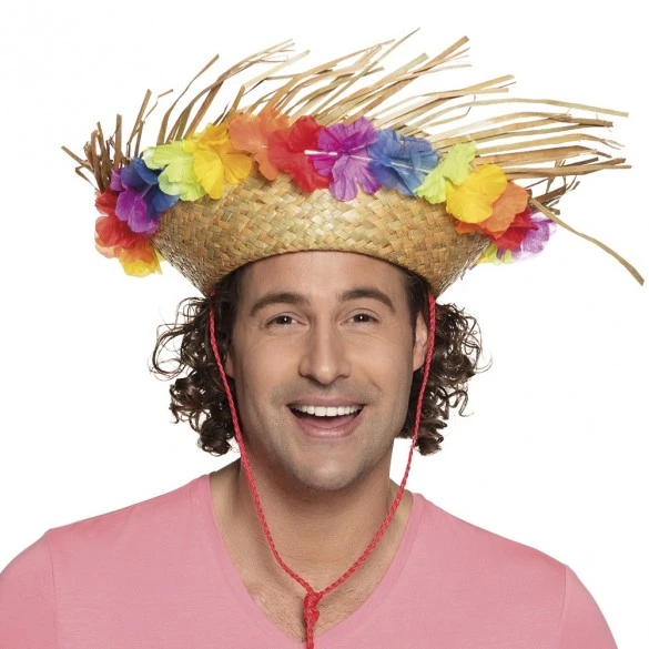 Très beau chapeau exotique en paille orné de fleurs polyester qui vous permettra de compléter votre déguisement thème des îles