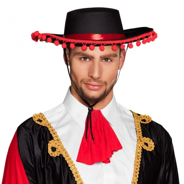 Chapeau satiné avec pompoms rouge pour déguisement Espagnol