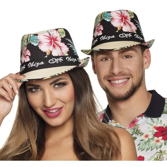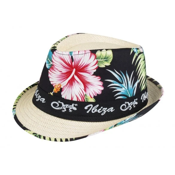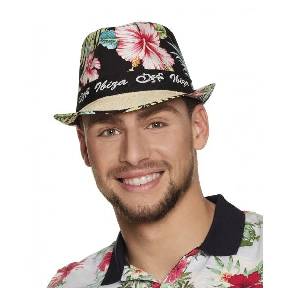 Faites voyager vos amis en complétant votre déguisement avec ce chapeau motif des iles avec fleurs hibiscus