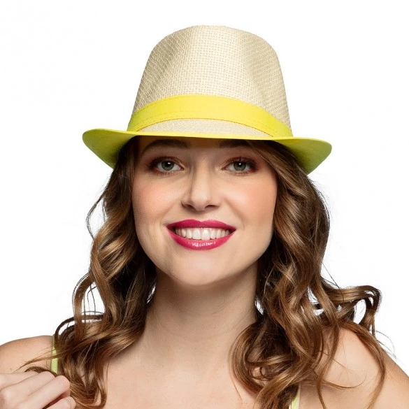 Ambiance vacances avec ce borsalino paille bordé jaune fluo