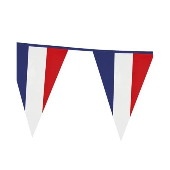 Pour une soirée patriote ,cette guirlande plastique de 10m, avec pavillons triangulaires tricolores bleu- blanc-rouge.