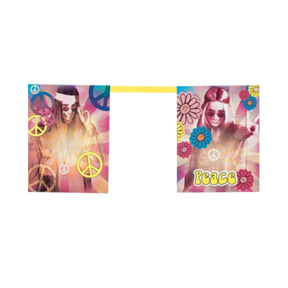 Guirlande avec pavillons imprimés motif années 70 hippie pour une déco d’anniversaire ,une fête à thème ou soirée musicale