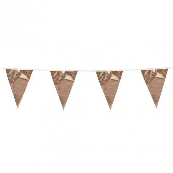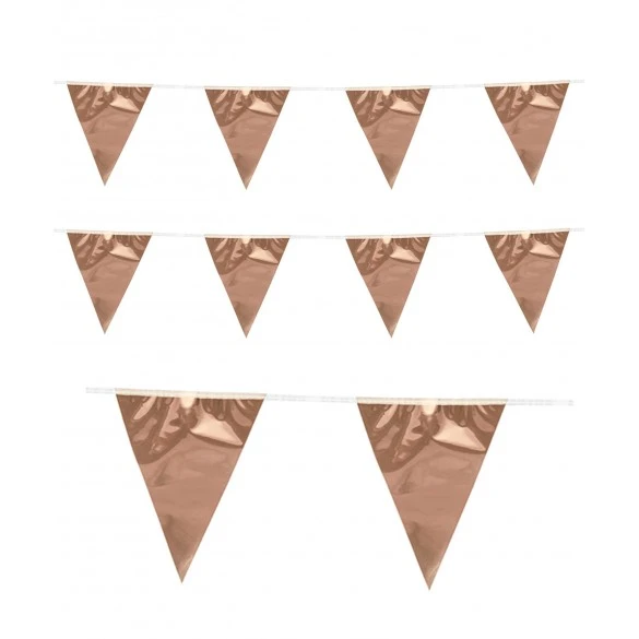 Choisissez cette guirlande de fanions métallisé rose gold de 10m de longueur pour compléter votre décoration à thème ! Idéal pour une décoration en extérieur ou l’intérieur.
