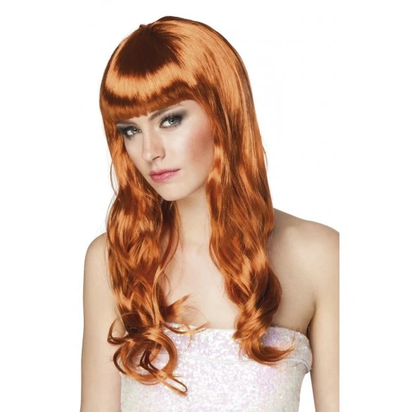 Perruque avec frange et cheveux longs couleur rousse.
