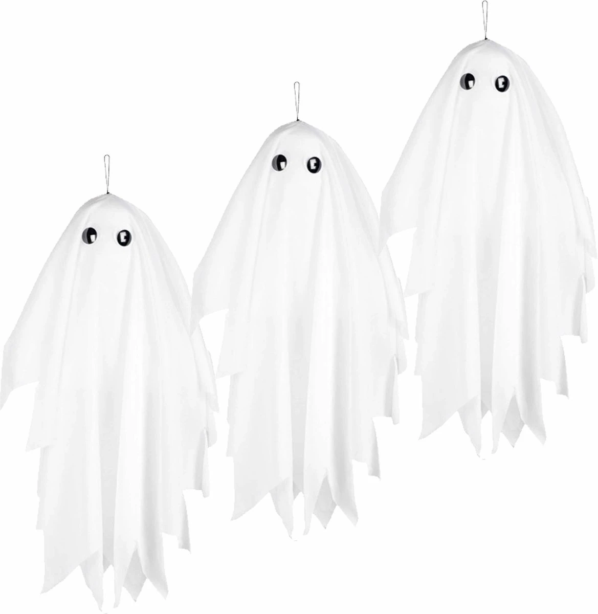 Set de 3 fantômes de décoration d’horreur suspendus avec mouvement et son. Le fantôme d’Halloween bouge et fait du bruit. Taille : L48cm. Fonctionne avec 2 piles AA, celles-ci ne sont pas incluses. Poupées de décoration suspendues sur le thème d’Halloween.