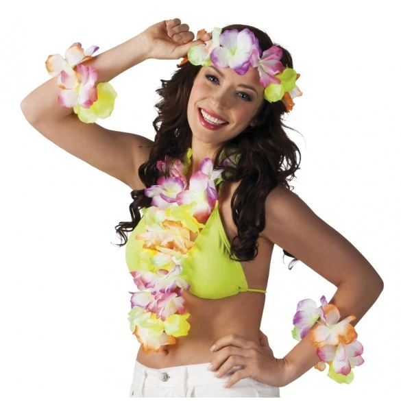 Pour votre tenue d’hawaienne ,ce complémént indispensable avec ce set de fleurs hawai: coiffe,collier,et bracelets.