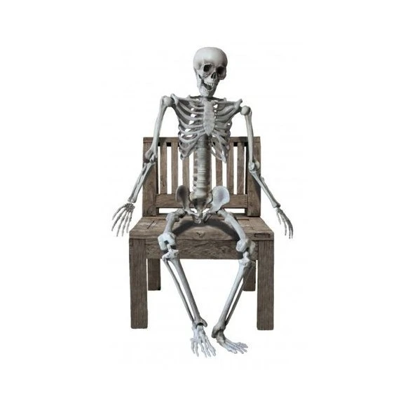 Squelette de taille humaine, 160cm. Vous pouvez aussi bien le suspendre que l’asseoir. Chaise non fournis.